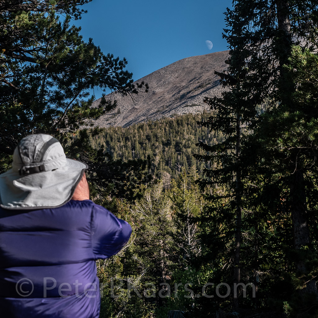 Catching the moon (Bryan); top of Lehman Creek Trail, Great Basin National Park, Nevada, September 14, 2021, 16:46